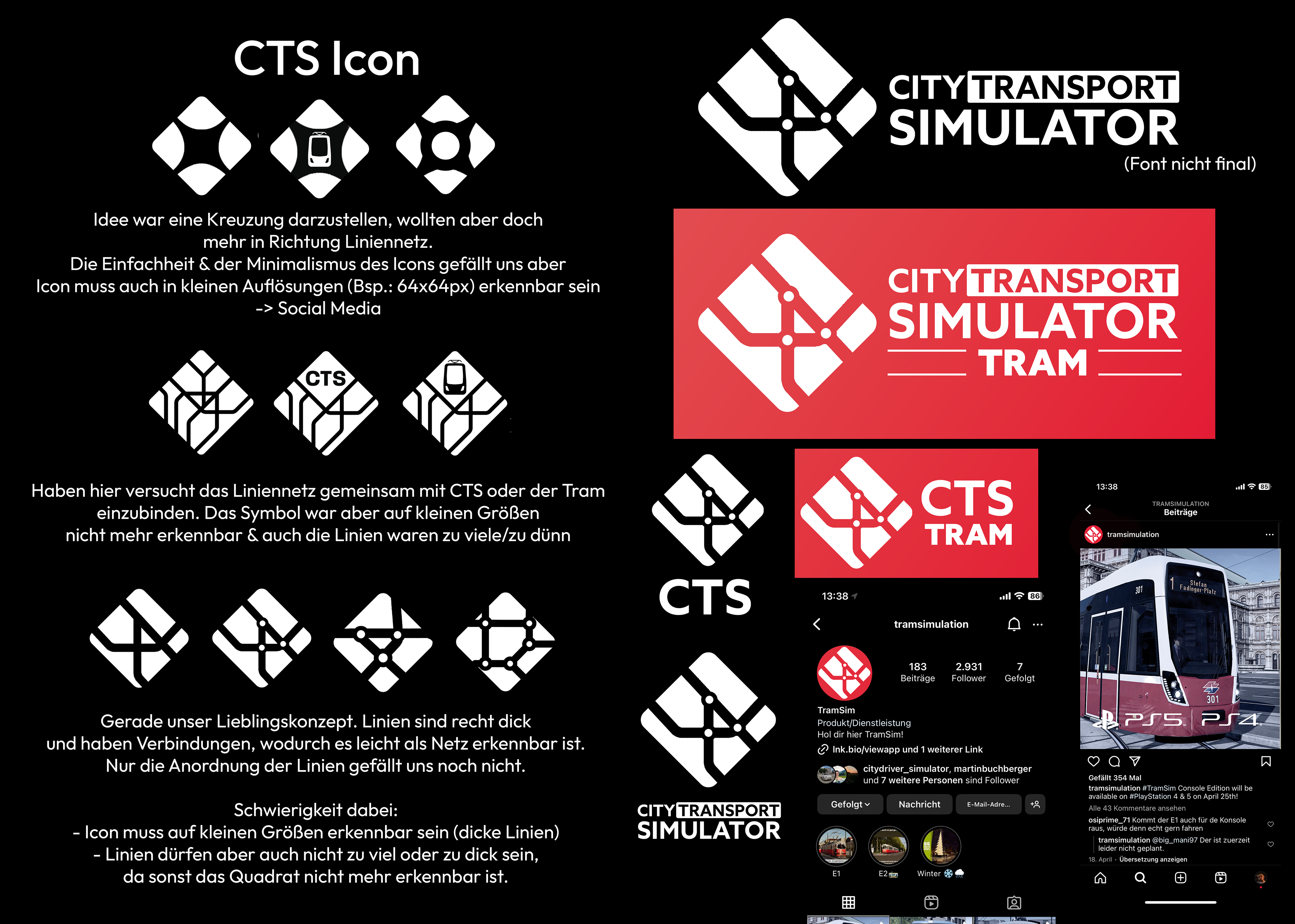 Ein zentraler Fokus lag auf Balance und Modularität. Frühere Logos von ViewApp waren dafür nicht ausgelegt, was vor allem bei Social-Media-Grafiken zu Problemen führte. Zusätzlich wurde ein klar erkennbares Icon benötigt, das unabhängig vom Schriftzug als CTS Brand Identifier funktioniert. Die Wahl fiel auf ein Liniennetz-Icon, da das Erstellen und Managen von Linien ein zentrales Gameplay-Element von City Transport Simulator ist und das Spiel klar von anderen Simulationen abhebt.